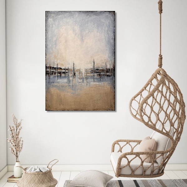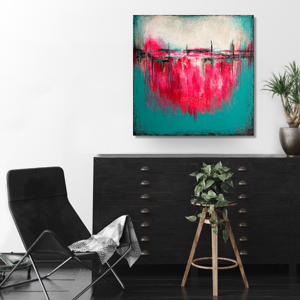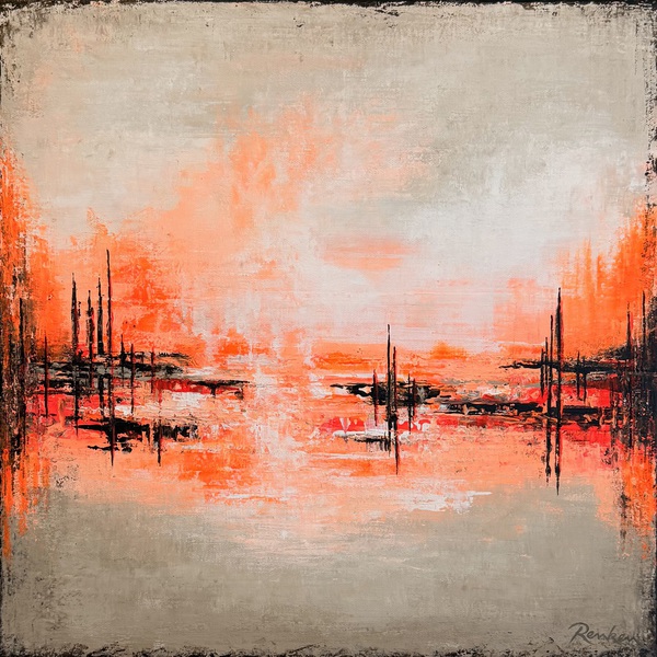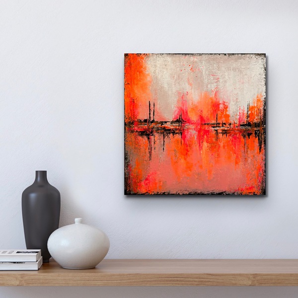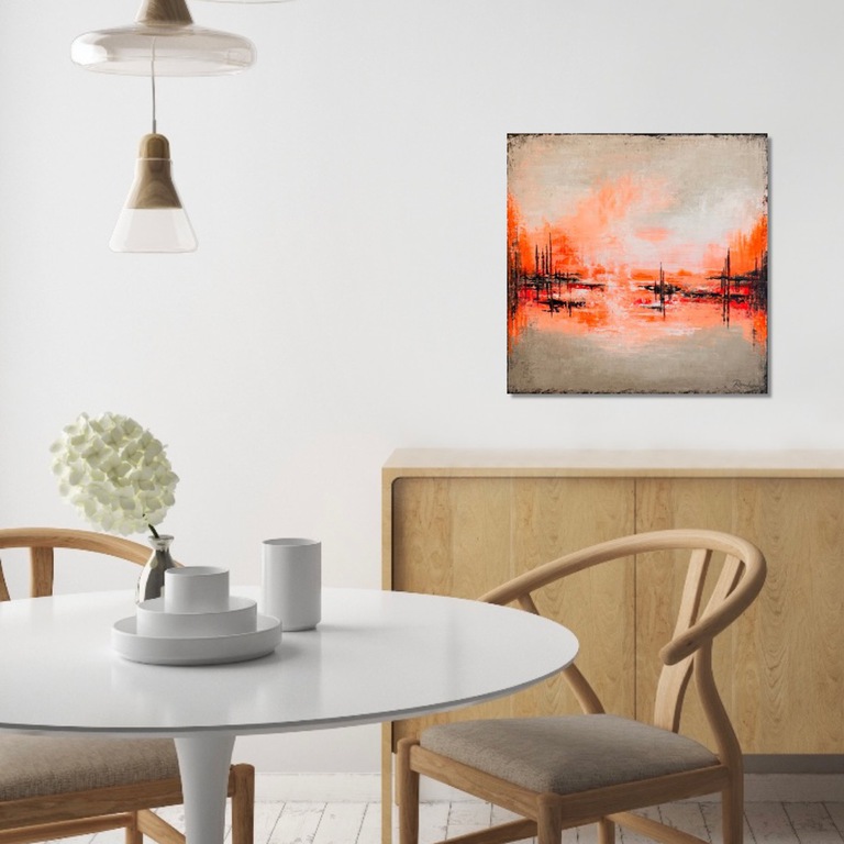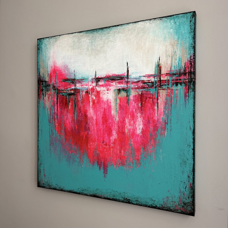 All paintings are unique. Each is acrylic on canvas mostly applied by spatula.The paintings do not require any additional framing in the first placesince each motive continues over the edges of the painting’s wooden frame.